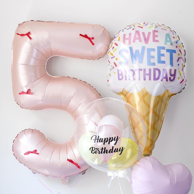 リボン付き 90cm 数字のバルーン & 名入れ アイスクリーム 誕生日 バルーン セット 【浮かせてお届け】 女の子 ナンバー 風船 バブルバルーン ナンバーバルーン