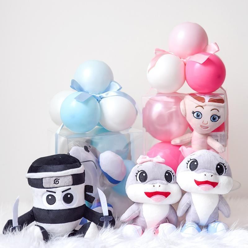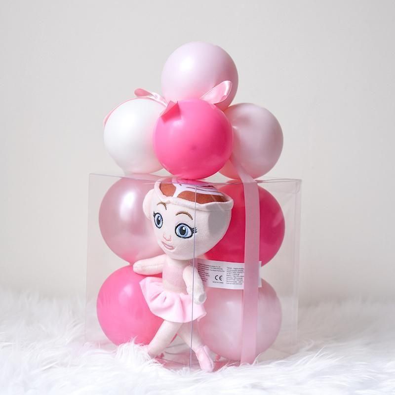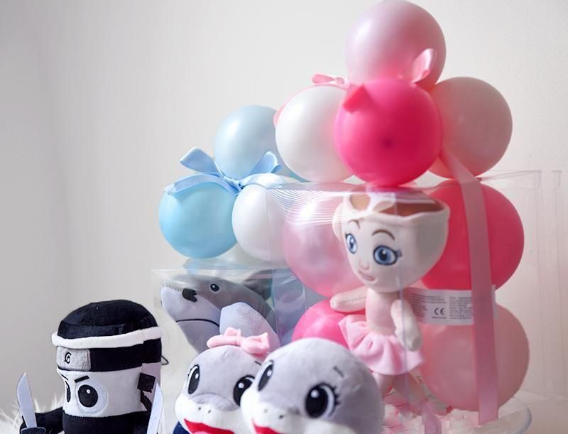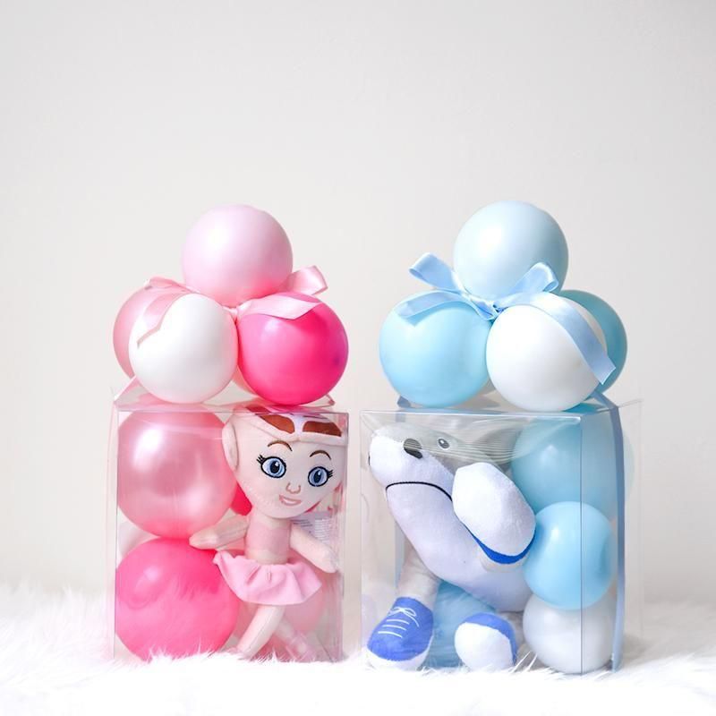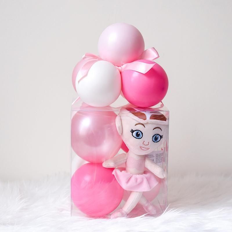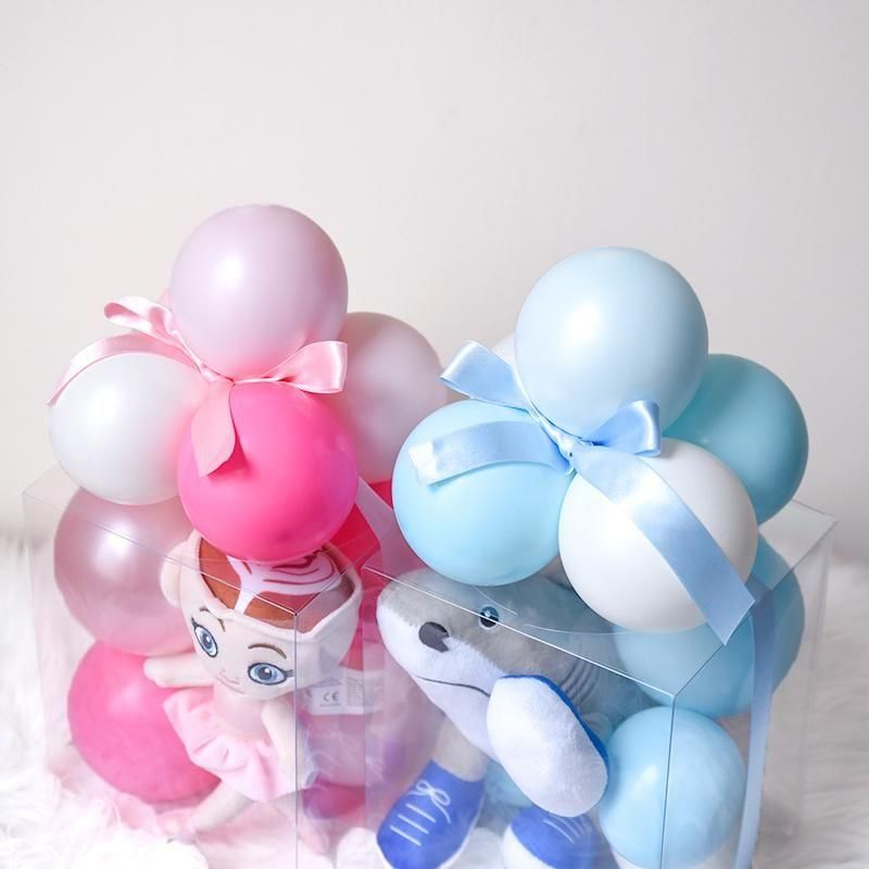 子供が持ちやすい大きさのクリアボックスに、カラフルなバルーンと一緒に入れてお届けします。