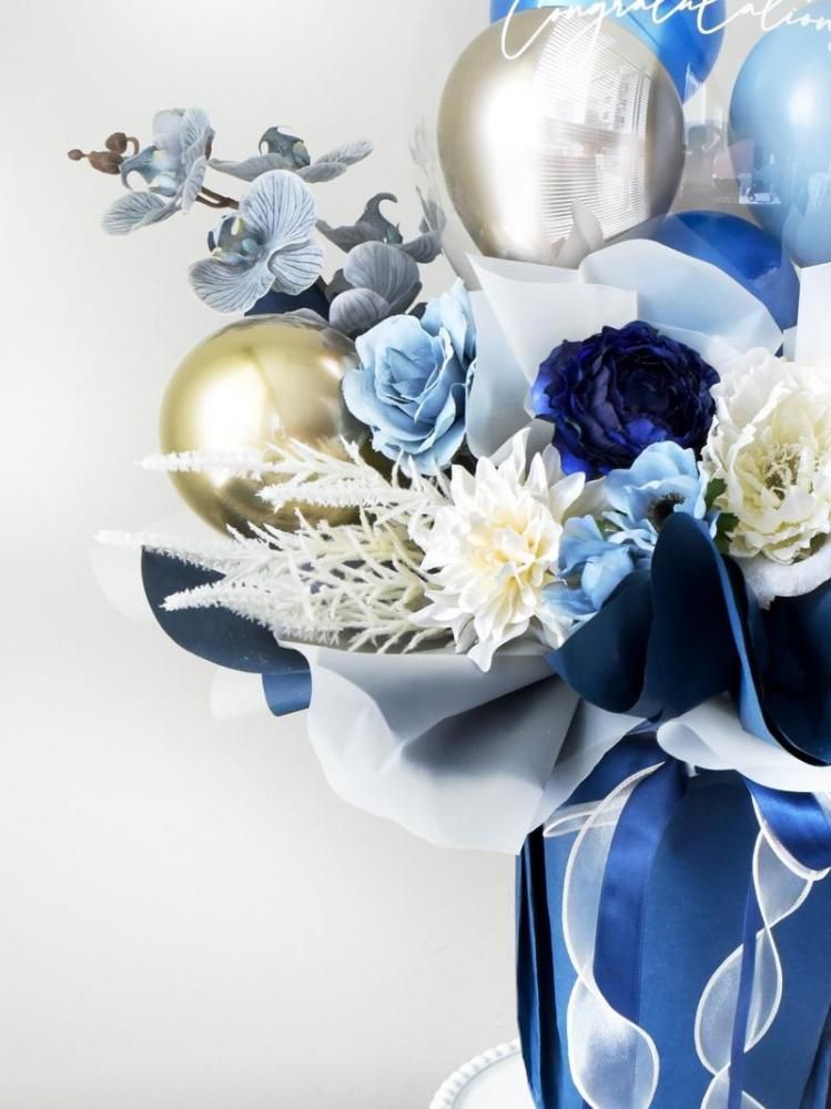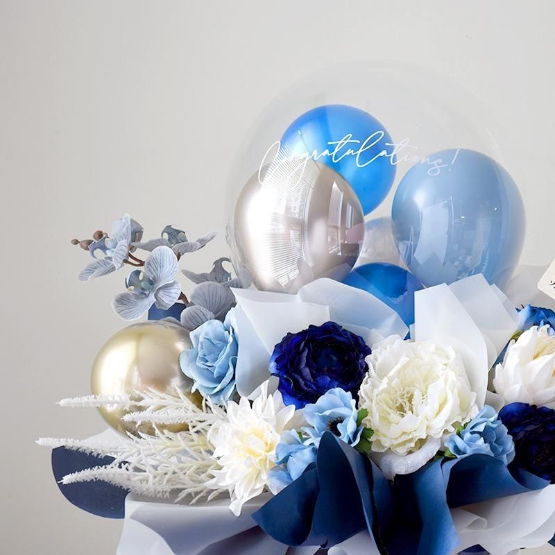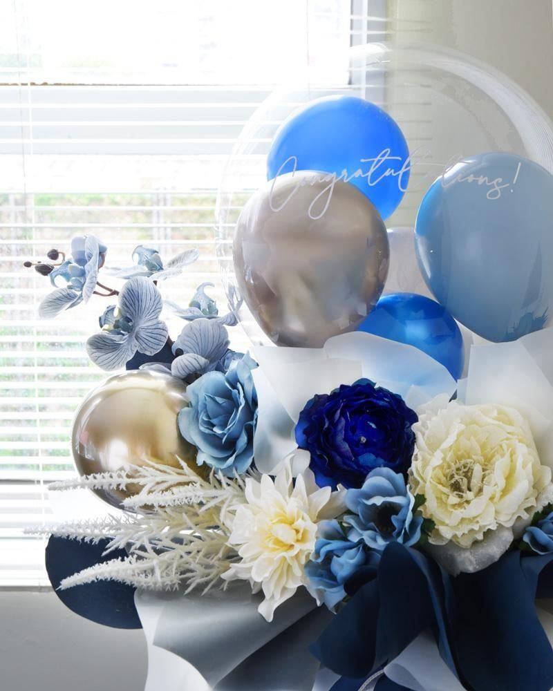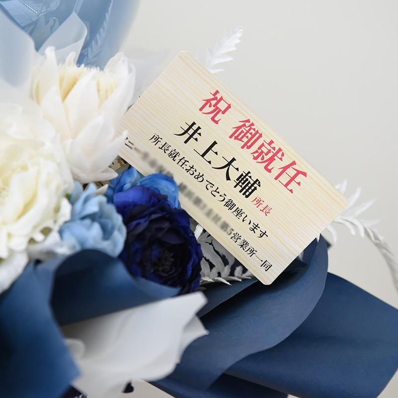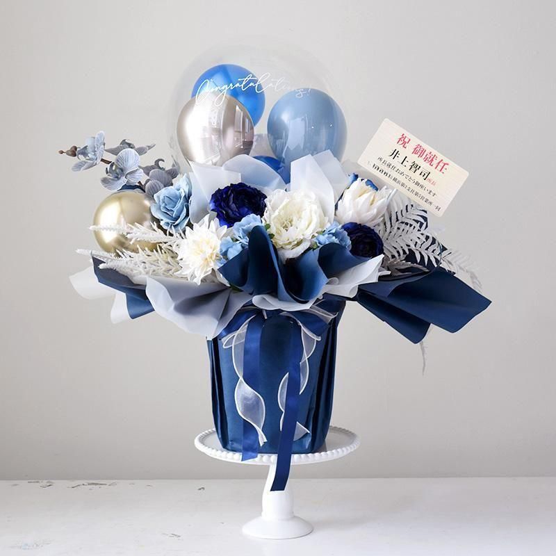 商品説明 上品で高級感ある胡蝶蘭のアレンジメント。 深いブルーとホワイト、ゴールドを上手にミックスして、 落ち着きのある大人なデザインへと仕上げました。 男性宛てへのギフトとしても人気が高い落ち着いたカラーと しっかり高さがある置き型アレンジがお祝いごとの空間を華やかに演出。 透明なバルーンへはお祝いの言葉など、お好きな文字が入れられます。 流れるようなスクリプト体が全体の雰囲気にマッチするのでおしゃれ感アップ。 アレンジメントへはお祝いごとの贈り物に欠かせない木目の立て札付きです。 立て札はテンプレートに沿って入力するだけでOK。 アレンジメントに立て札が付くときちんと感がプラスされます。